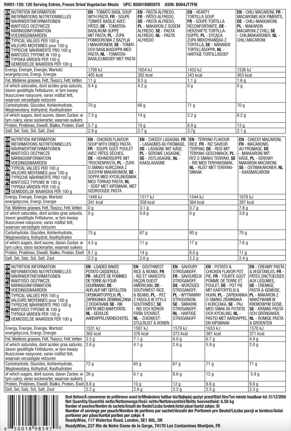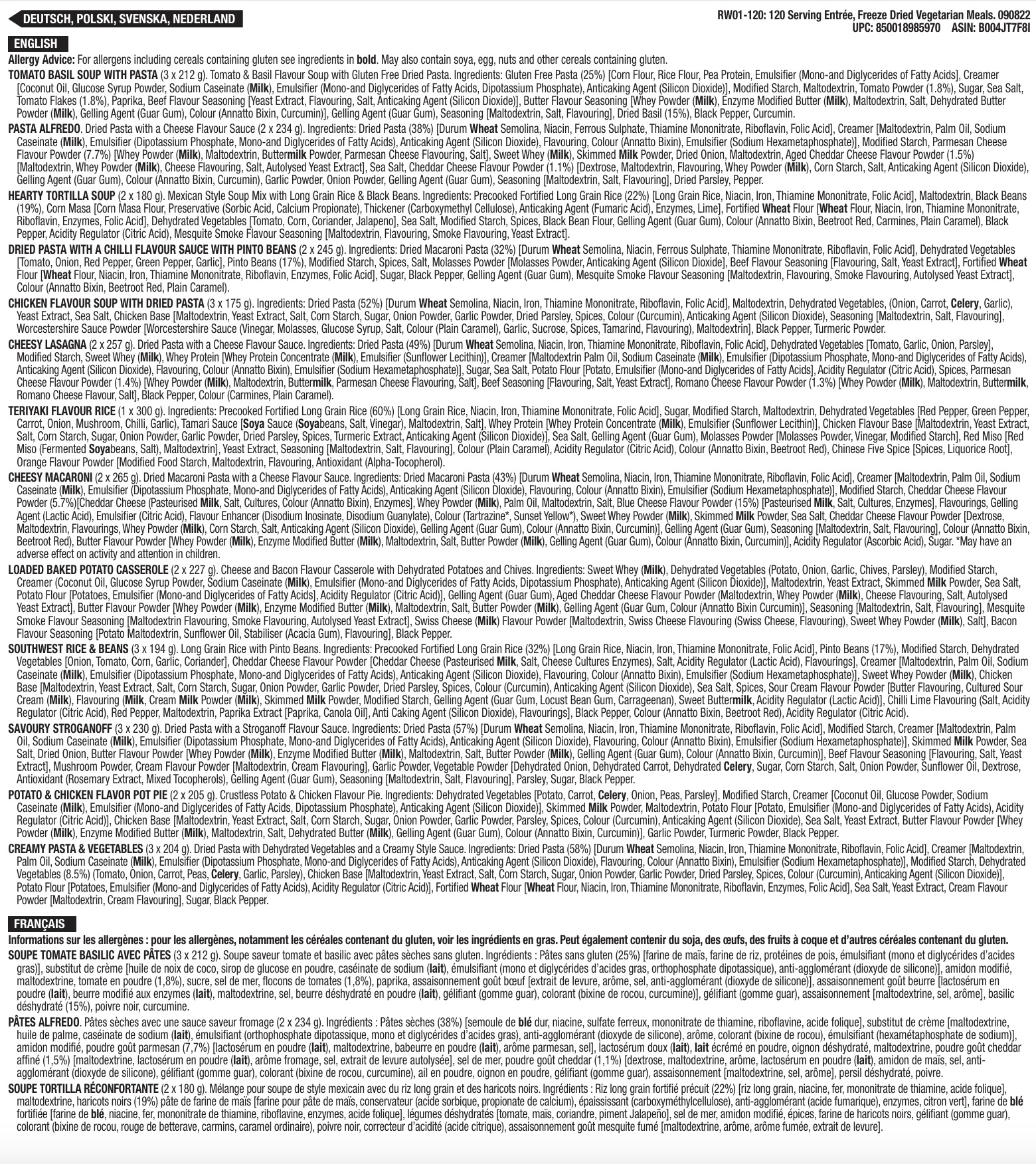 Hauptgericht für 120 Portionen, gefriergetrocknete vegetarische Gerichte, bis zu 25 Jahre