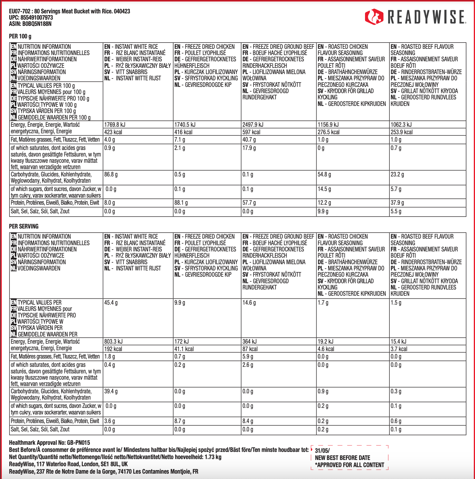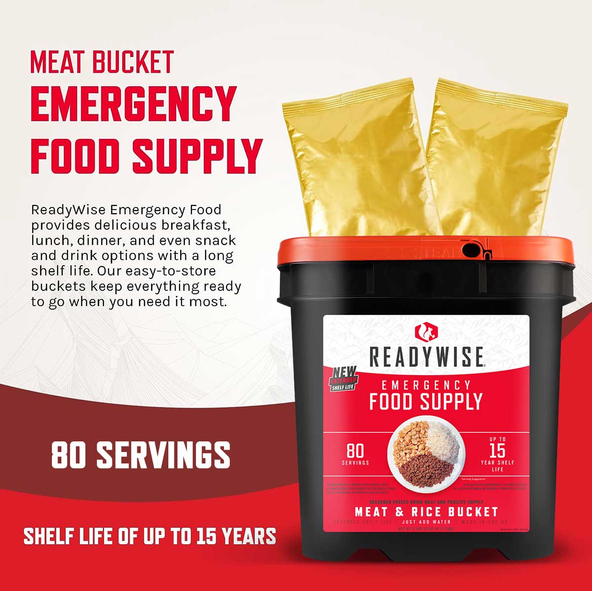 Notre seau de 80 portions de viande lyophilisée et de riz est un complément parfait à toute réserve alimentaire. Que vous soyez touché par une tempête de neige, une inondation, une panne d'électricité, d'une autre urgence météorologique ou que vous souhaitiez simplement préparer un repas facile à l'extérieur ou à la maison, ce seau est idéal pour vous. Ces aliments lyophilisés et déshydratés au goût délicieux sont prêts en quelques minutes, il suffit d'ajouter de l'eau. Ils sont également présentés dans des seaux empilables dotés d'une poignée Grab-N-Go, ce qui permet de les stocker et de les transporter facilement.
