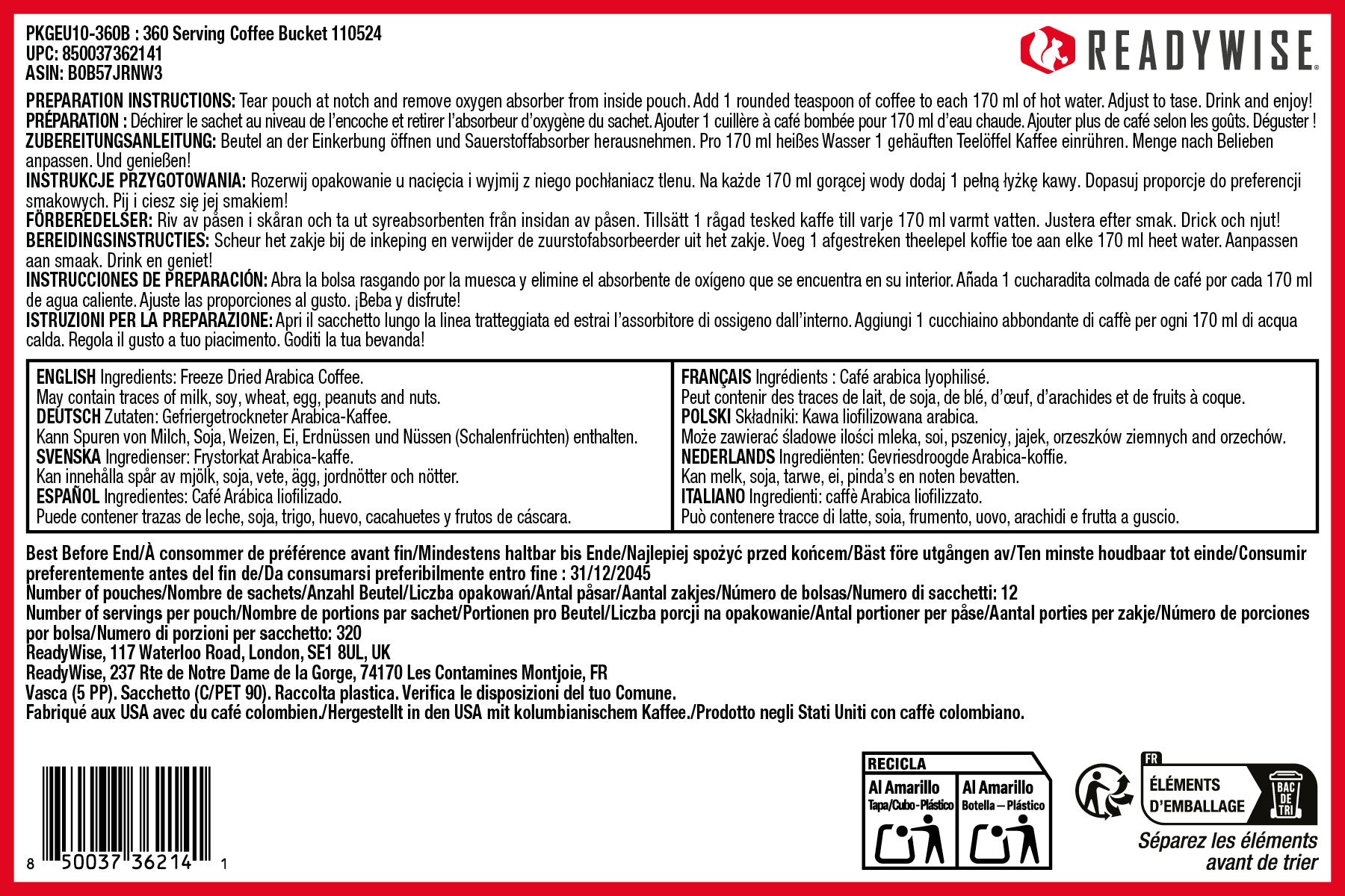 ReadyWise, 360 porcji, kubełek kawy, do 15 lat trwałości na półce